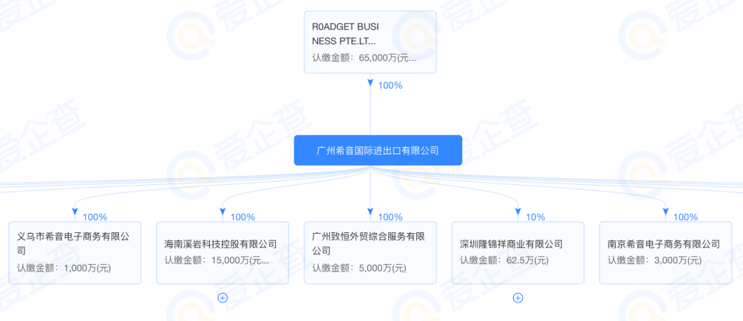 广州希音国际进出口有限公司目前的注册地址位于广州番禺,唯一的股东是Roadget Business PTE.LTD.,持股比例为100%,认缴出资额6.5亿元。值得注意的是,Roadget是再2021年底才取代ZOETOP成为成为公司股东的。