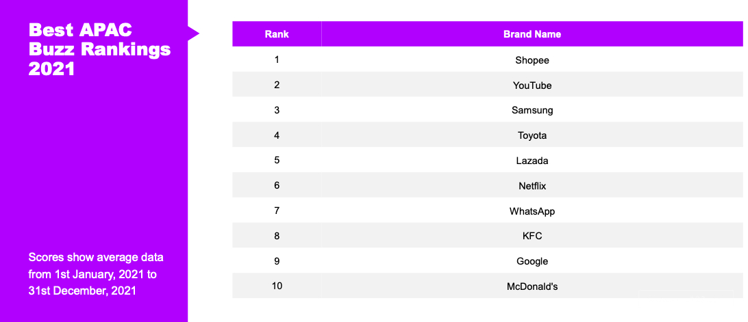 YouGov的口碑排行榜显示,Shopee在2021年在东南亚有很大的影响力。除了在亚太地区排名第一外,这个平台还在印尼、马来西亚和新加坡占据领先地位。在菲律宾、泰国和越南,Shopee排名第二。
