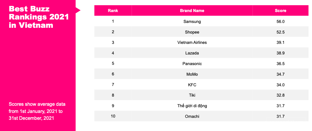 DNY123获悉,YouGov发布2021年越南最佳口碑排行榜,三星、Shopee和越南航空排名前三。