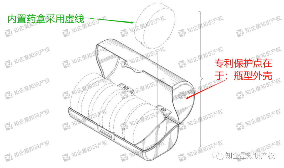 尤其需要注意的是,该专利保护点在于瓶型壳体,内置的分装药盒,采用虚线绘制,并没有要求保护,也就是说,不管内置七个药盒外观是否相同,只要采用相同壳体,就属于侵权!