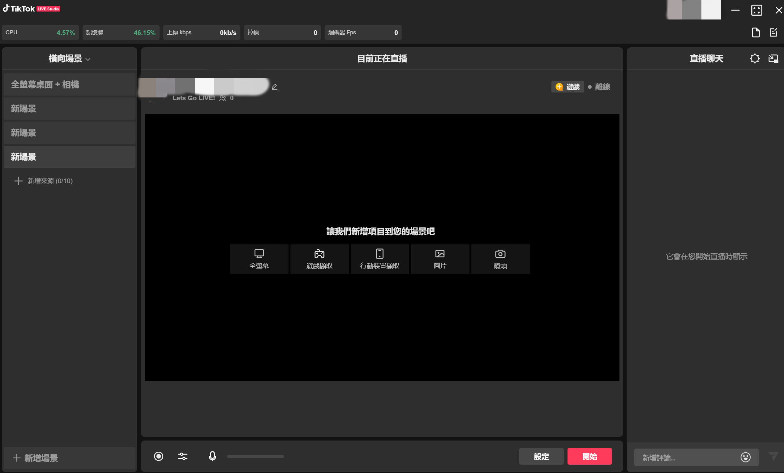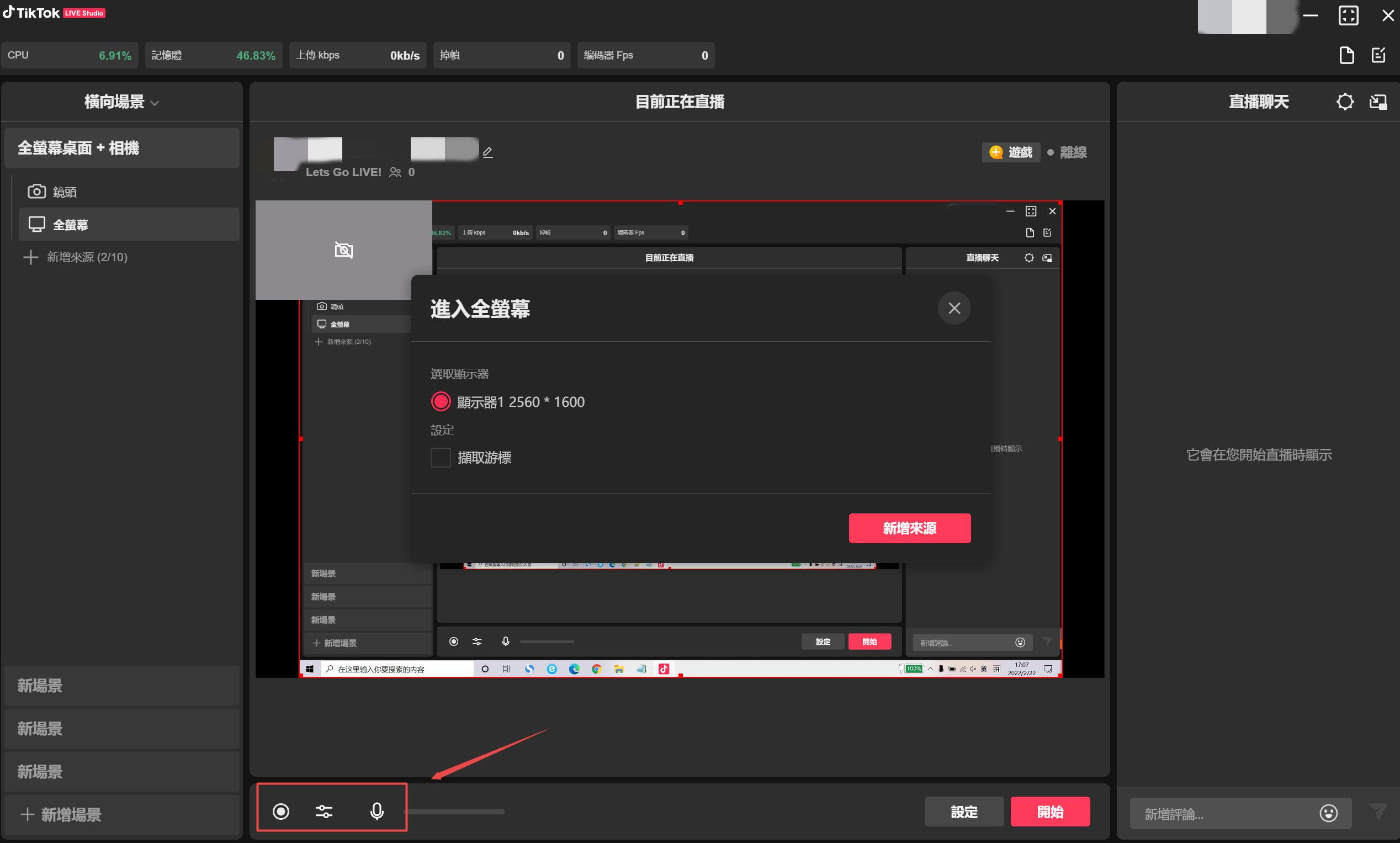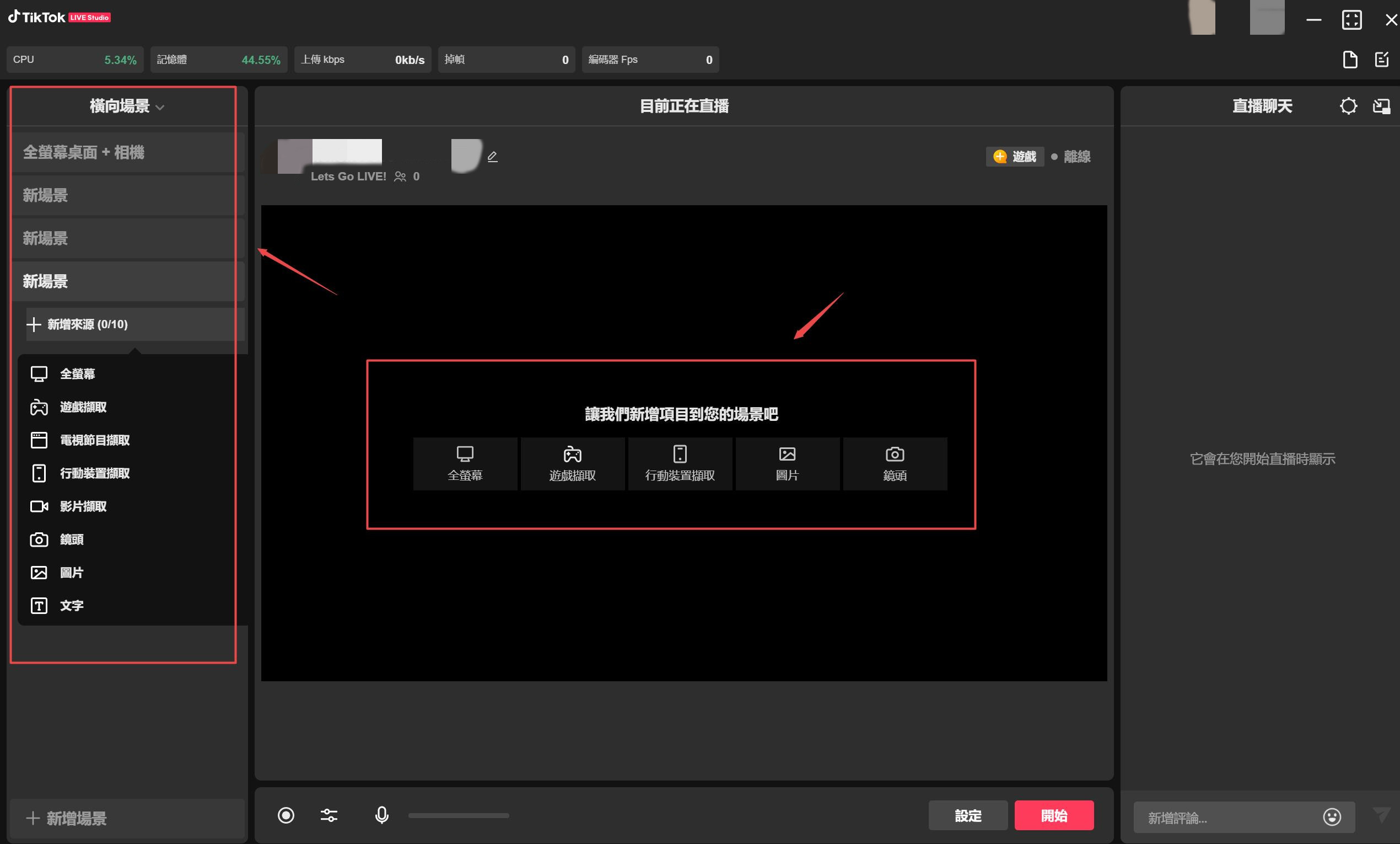 场景除了可以横向和纵向,我们还可以看到新增来源,支持全荧幕、游戏截取、电商节目、行动装置截取、图片、文字、镜头等。