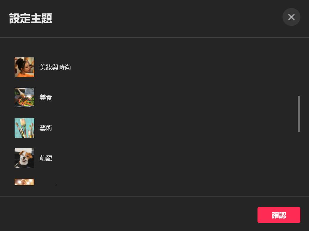 同时还可以设置直播的主题,包含萌宠、舞蹈、聊天、游戏等。