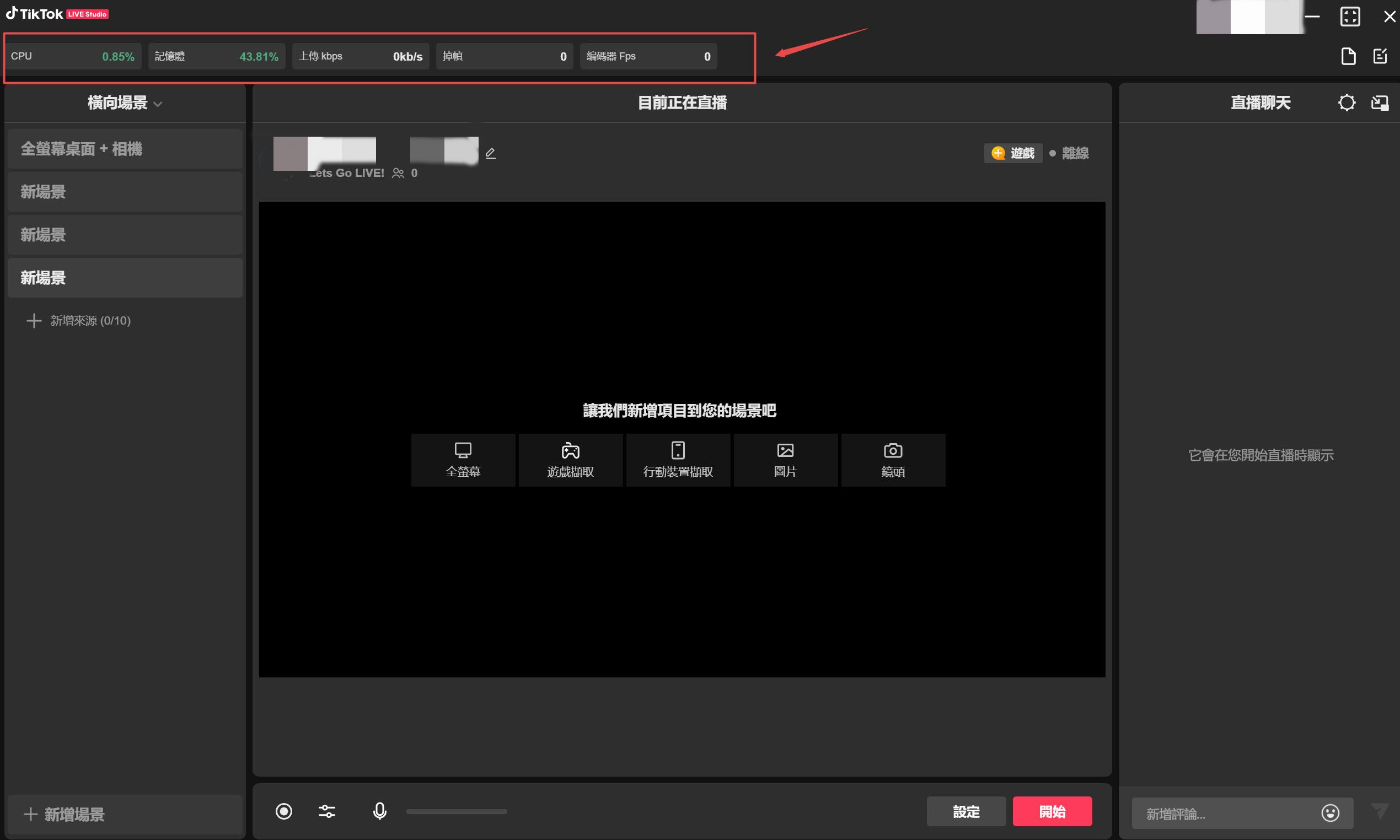 这里我们可以看到CPU和记忆体的使用情况,还有网络的上传速率,直播过程中的掉帧情况,以及编码器的使用,直播间的基本情况一目了然。