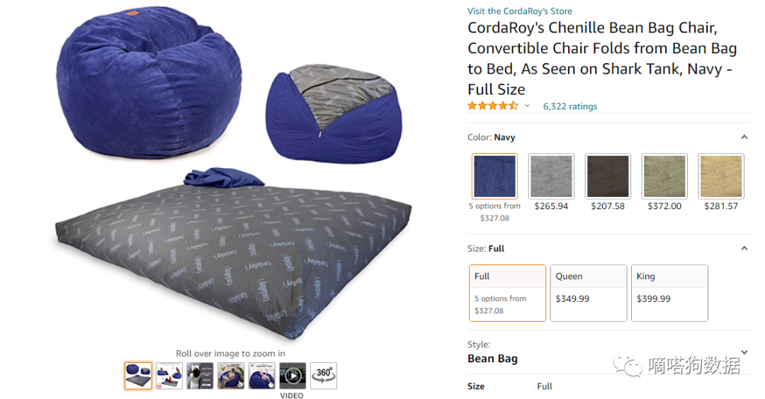 这款“shark tank豆袋椅”因为型号以及体积的特殊性,价格都不太一样,其中最便宜的一种组合为524美金。