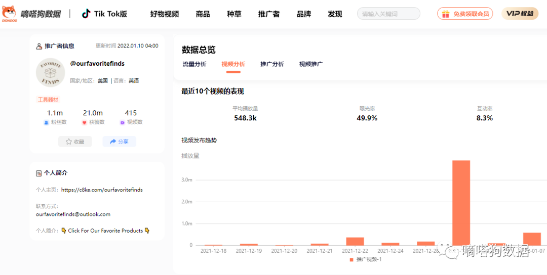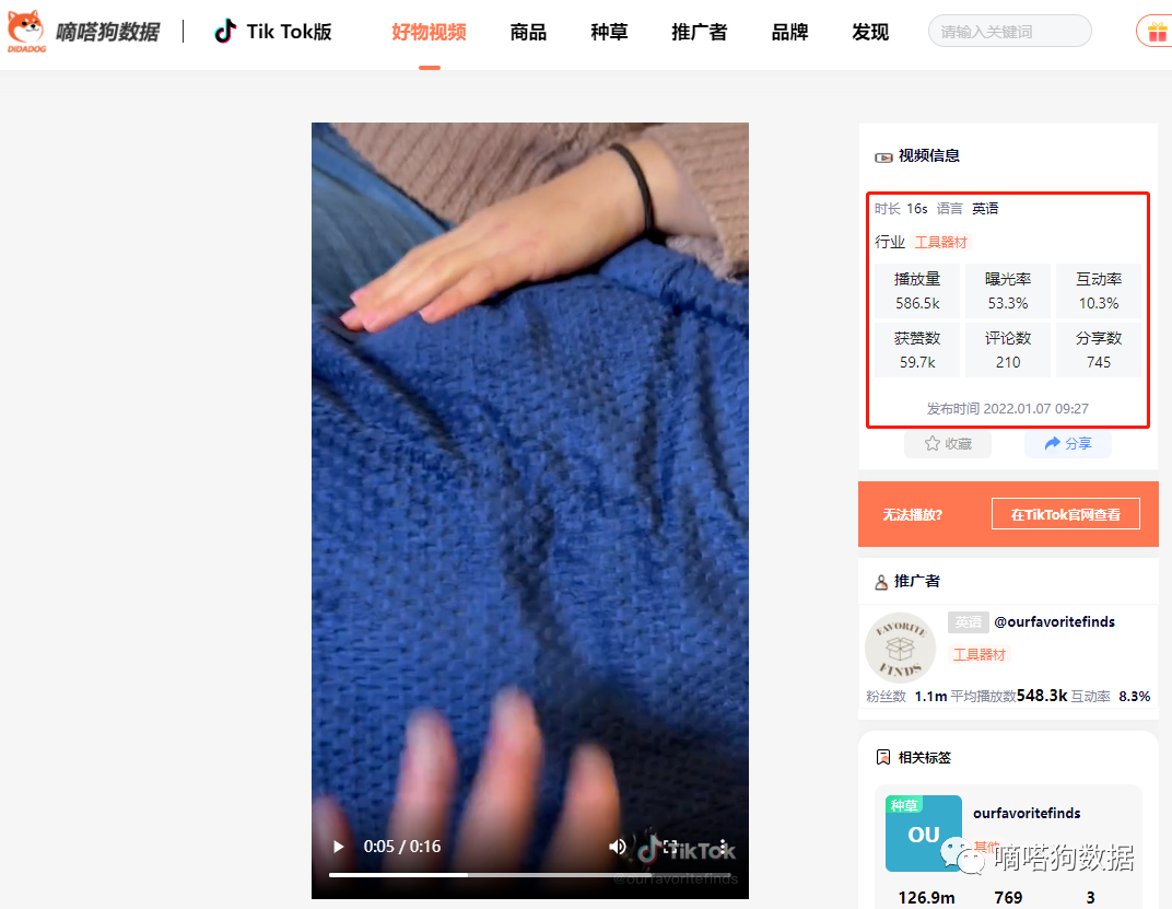 通过嘀嗒狗达人推广者数据,可以看到@ourfavoritefinds目前拥有110万粉丝,账号目前发布了415个视频,通过发布手工制作视频内容获得了2100万的点赞。