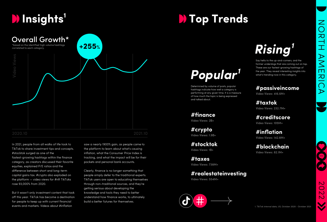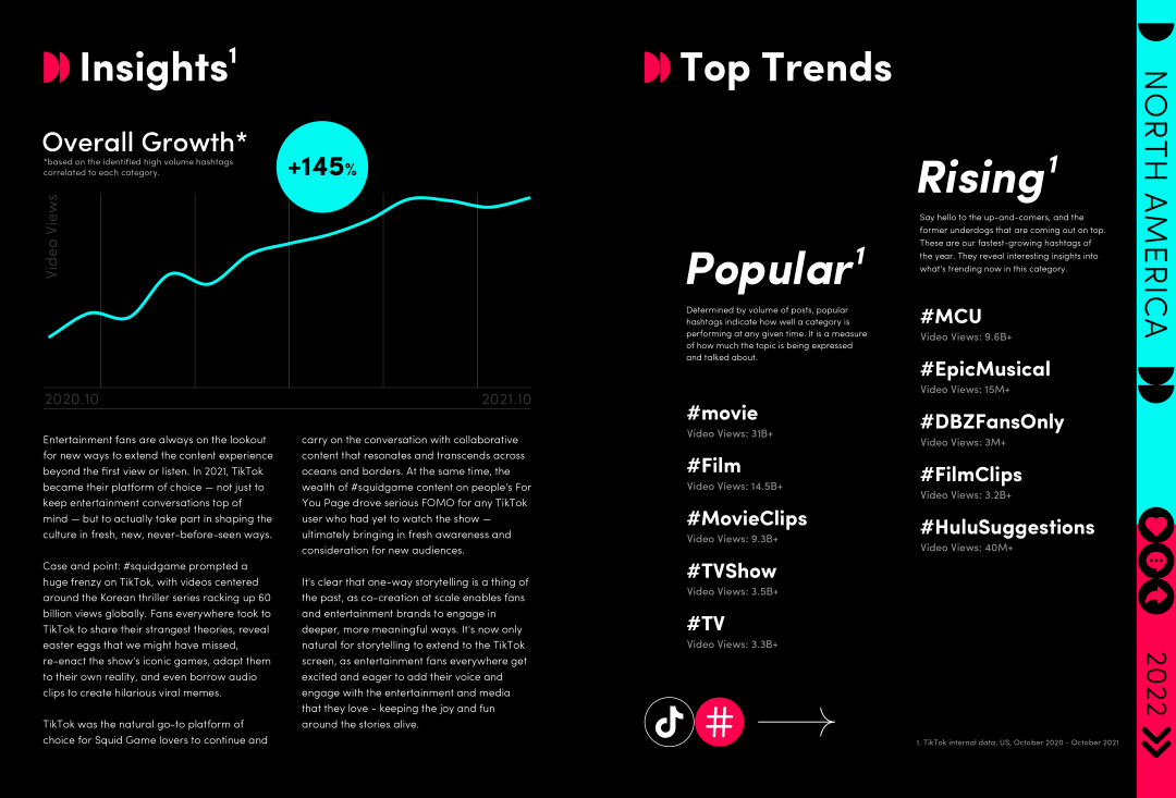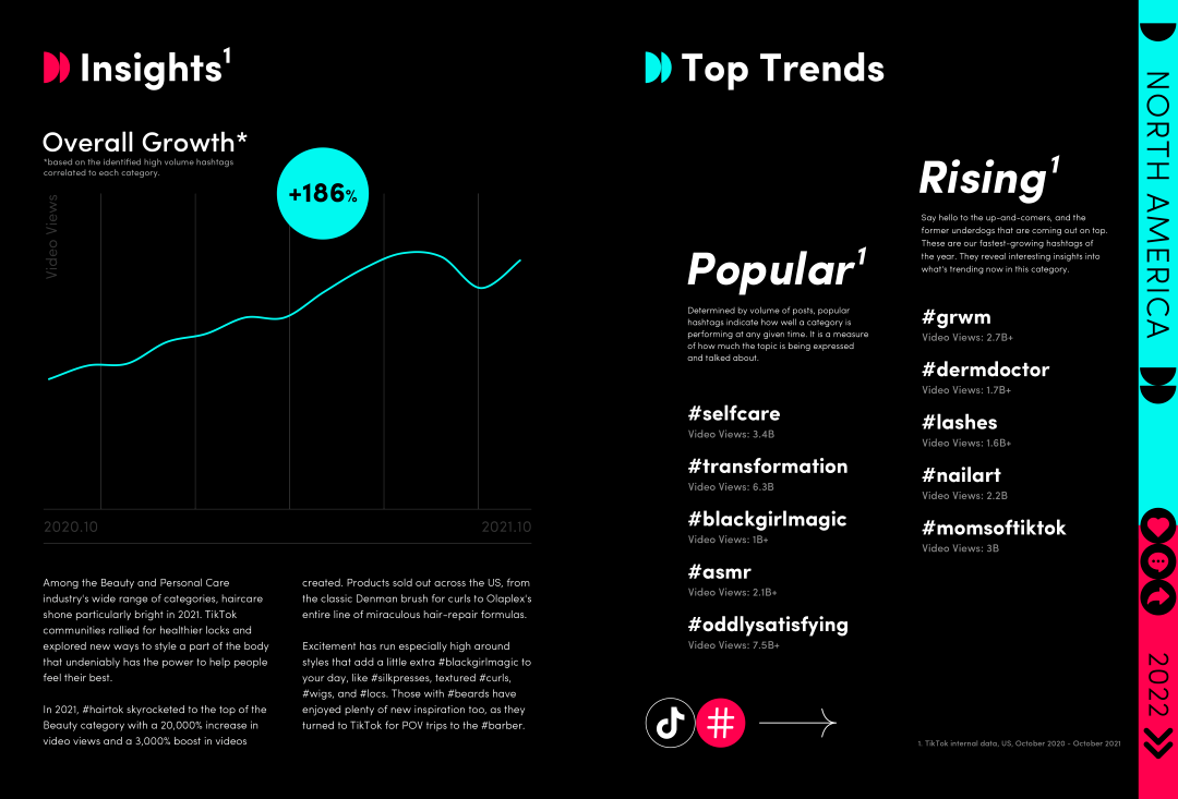 其中展示了TikTok上表现最好的内容类型、案例研究,深入探讨了TikTok官方认为在2022年推动品牌成功和在TikTok上产生影响力的领域。