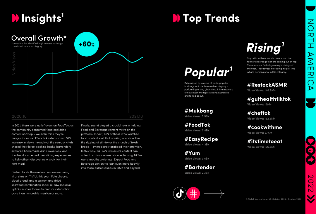 食品和饮料,增长60%:食品饮料业品牌内容增速相对来说较小,这是由于在TikTok的发展过程中,食品饮料类的内容一直非常受欢迎,所以相对来说增速放缓。