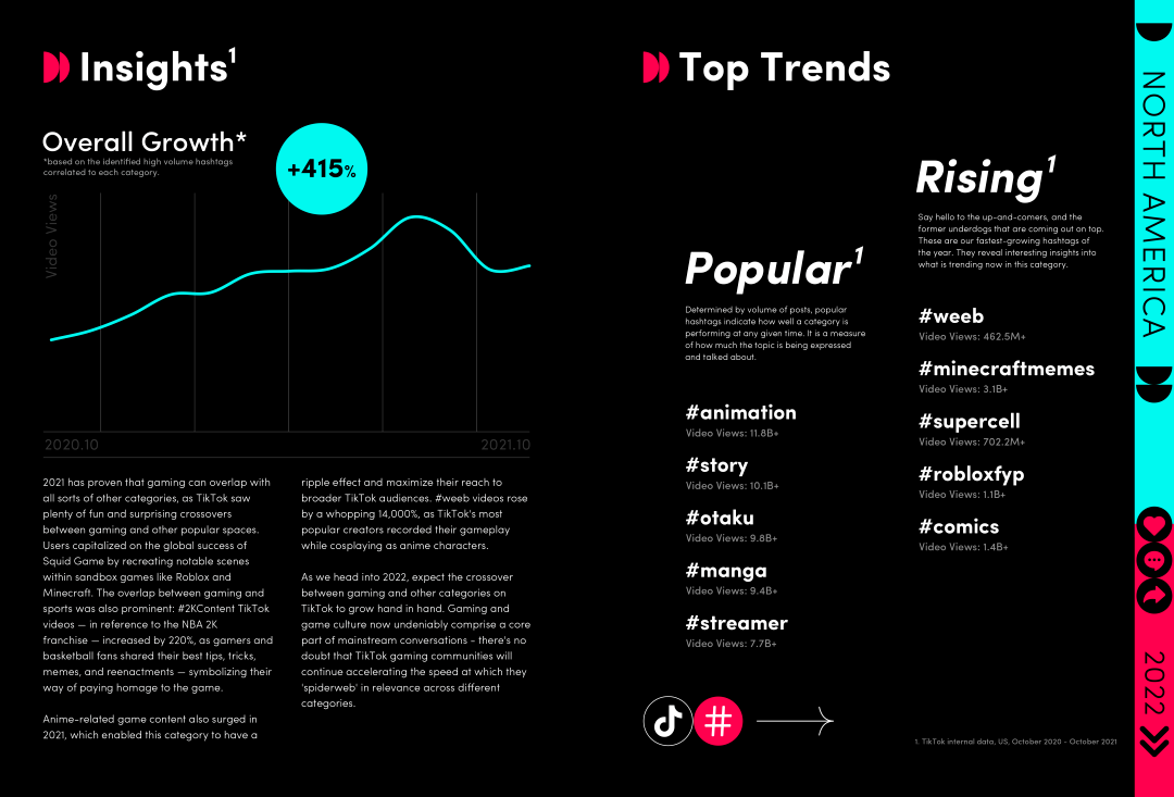 游戏,增长415%:游戏行业的内容在TikTok的增速最快,TikTok建议品牌可以与游戏领域的新兴创作者合作,并且不过多束缚地让他们使用自己独特的声音和风格创作品牌内容。
