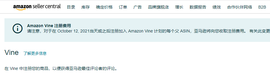 (2)Vine Program:卖家一次最多可以提报5 个ASIN,只要提供免费的产品,Amazon 就会透过此计划帮你找到Vine Voices 的消费者体验商品,并且留下产品评论。申请的时间需12 – 15 天,因此你可以在商品开卖时同时提交此计划(仅适用于产品Reviews 数量< 30 的ASIN)。
