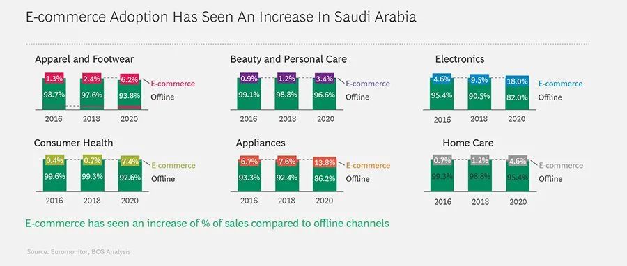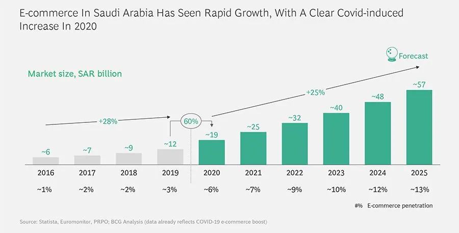 尽管增长异常迅猛,但沙特阿拉伯的电子商务仍处于起步阶段。2020 年,电子商务仅占沙特零售总额的 6%,而全球电子商务市场 2020 年的全球渗透率达到 18%。