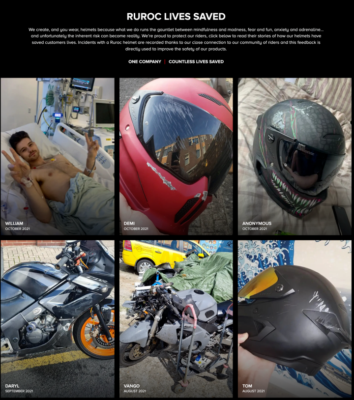许多品牌也开始慢慢在这一点上发力,开始注重社会责任和与消费者之间的连接。Ruroc也同样如此,在其网站中放置了被 Ruroc 头盔拯救生命的故事,以此强调 Ruroc 对社会的正向贡献。