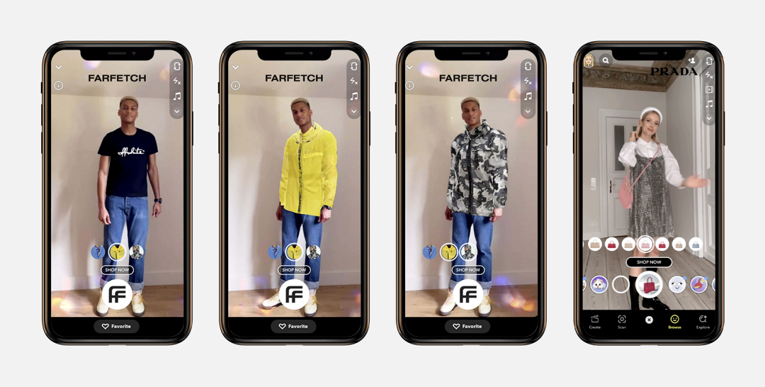 虽然技术尚未达到更真实逼真的 AR 体验,但各大服装品牌如 Gucci、Prada、Off-White 等都与 Snapchat 合作,将 AR 技术用于服装的虚拟试穿服务,包括全球服装电商平台 Farfetch。