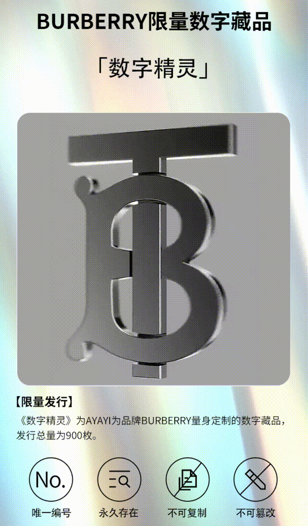 英国老牌时尚屋 BURBERRY,一直在探索数字化转型,在 10 月的天猫数字藏品活动中将大众所熟知的博博鹿形象打造成了数字藏品,名为 “数字精灵”,限量 900 份。消费者除了能够买到一个有唯一编号、永久存在、不可复制、不可篡改的 BURBERRY 博博鹿 “数字精灵” 外,还能收到一条全球限量首发的实体围巾。