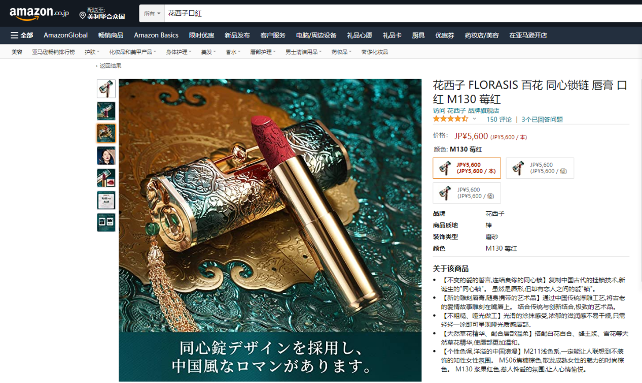 2020年花西子高举着“东方彩妆”的旗帜进驻日本,便一跃成为日本最喜爱的中国彩妆TOP1。据其官方数据,花西子2020年3月才正式登陆日本亚马逊,但其“同心锁口红”上线首日便进入了亚马逊口红销售榜前三名。