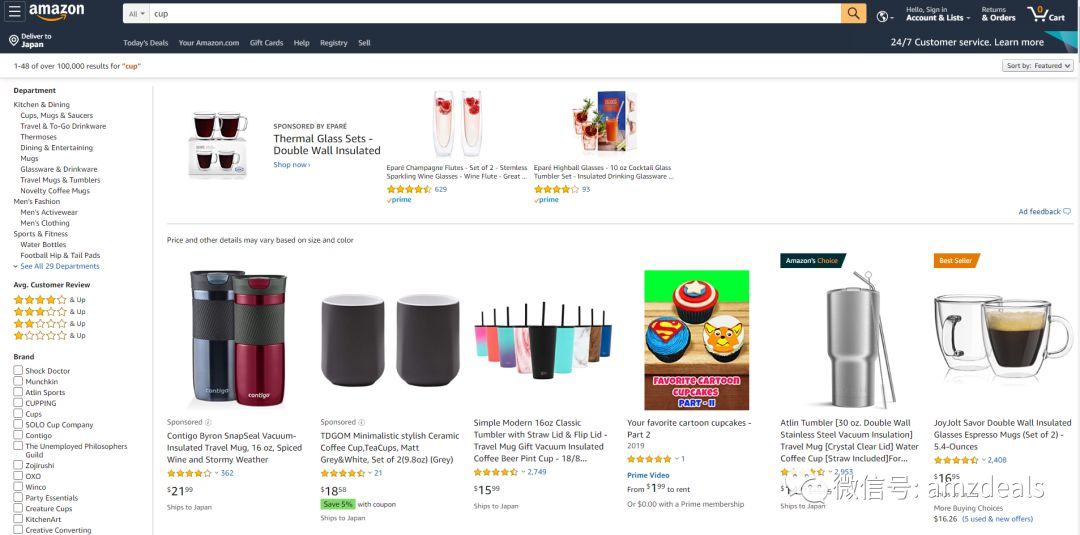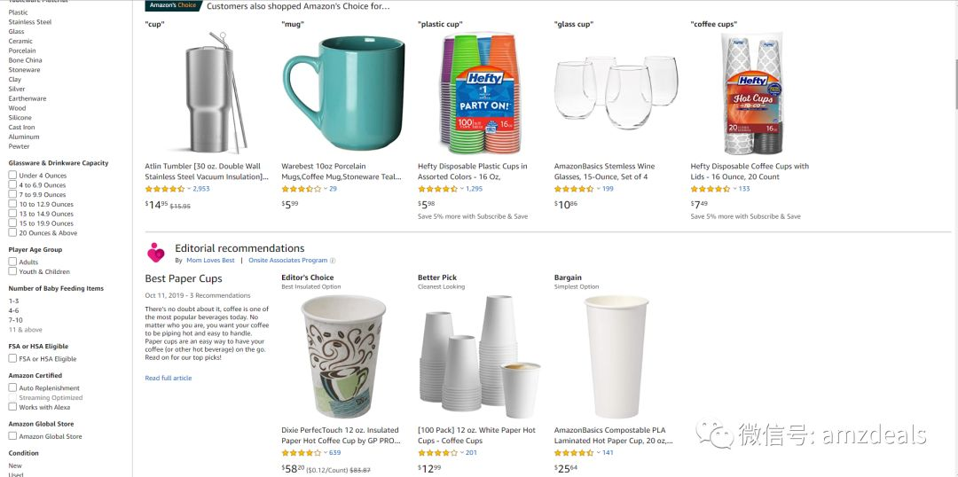 大家都知道我们先来看下亚马逊的首页各个商品的分布情况。以美国站cup(杯子)作为例子。