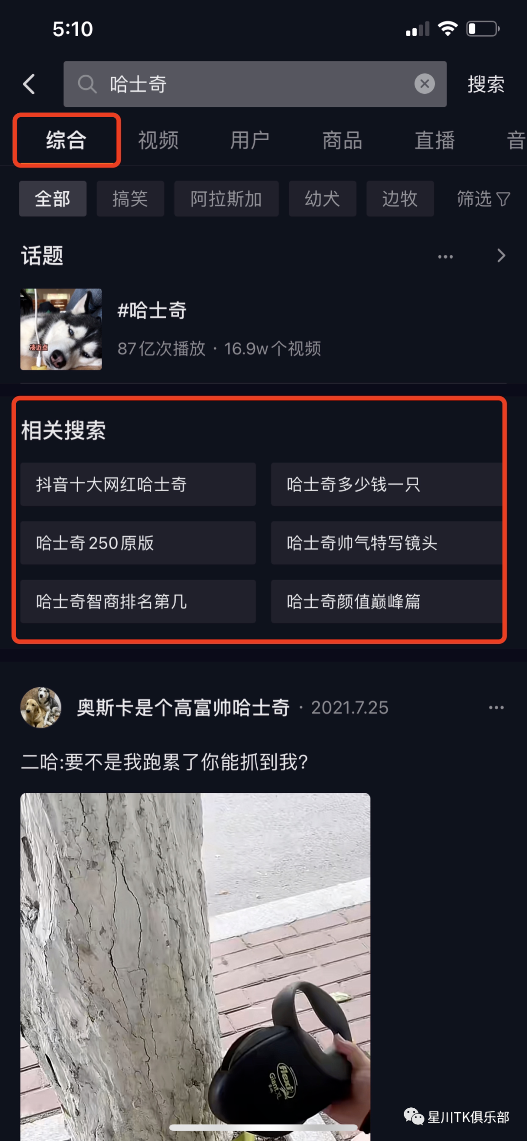 软件上一个“综合”的选项卡下面,显示出来各种不同短视频up主的第一个“哈士奇”相关视频。