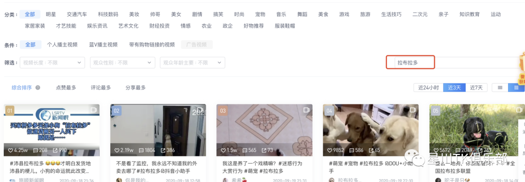 可以看到,能找出整个抖音平台里最近3天的“哈士奇”热门视频。