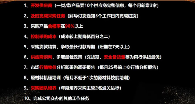 同时,对采购经理也可采用量化目标管理,对供应商实施管理机制,对关键业绩指标进行评价,发布相关有效奖励以及来激励供应商不断完善产品质量,不断改进。