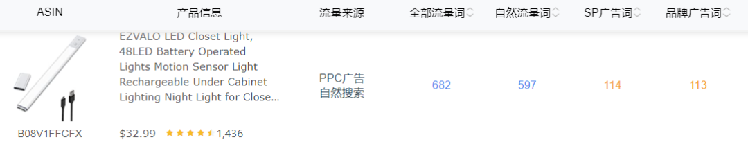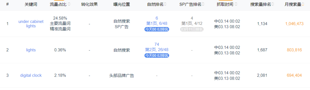 数据还显示,其最大的流量词为“under cabinet lights”,以自然搜索和SP广告进行曝光,月搜索量约为1046473;