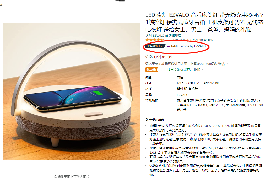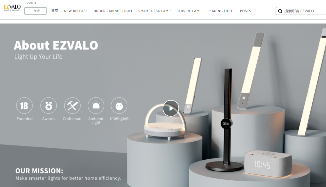 进入EZVALO的亚马逊品牌店首页,可以看到目前店铺内共有5款灯光系列感应产品正在售卖。