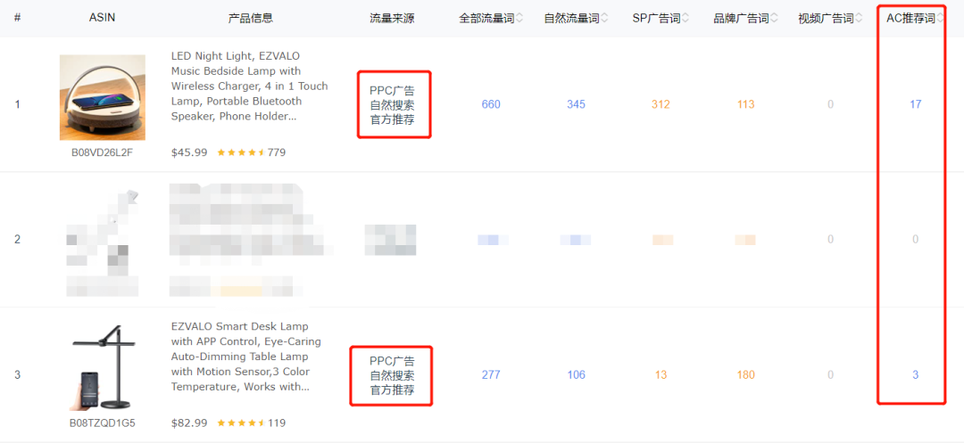 EZVALO的音乐床头灯、智能台灯在近30天的流量词构成主要有PPC广告、自然搜索流量及官方推荐流量,分别为660个和277个,其中进入自然搜索结果前3页的流量词有345个和106个。