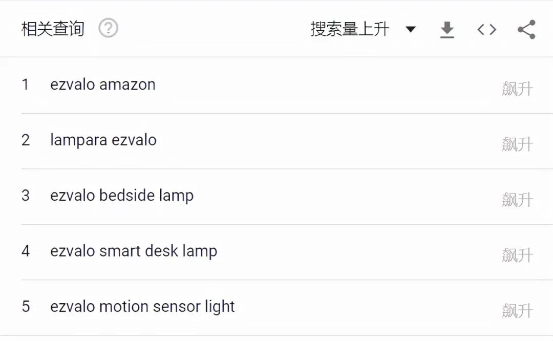 通过挖掘“EZVALO”的细分话题,搜索该主题下的相关关键词,发现“ezvalo amazon”“ezvalo bedside lamp”“lampara ezvalo”等相关关键词的搜索量飙升。