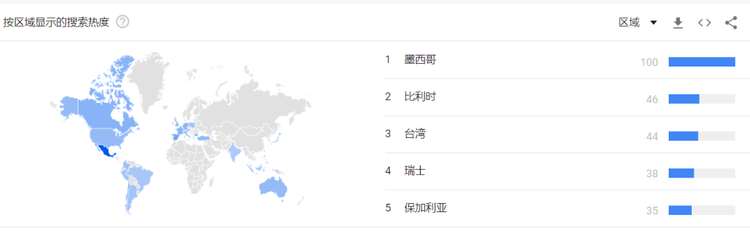 从区域搜索热度上来看,墨西哥、比利时、中国台湾、瑞士、保加利亚这五个地区的用户搜索量最多。