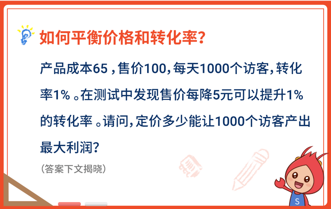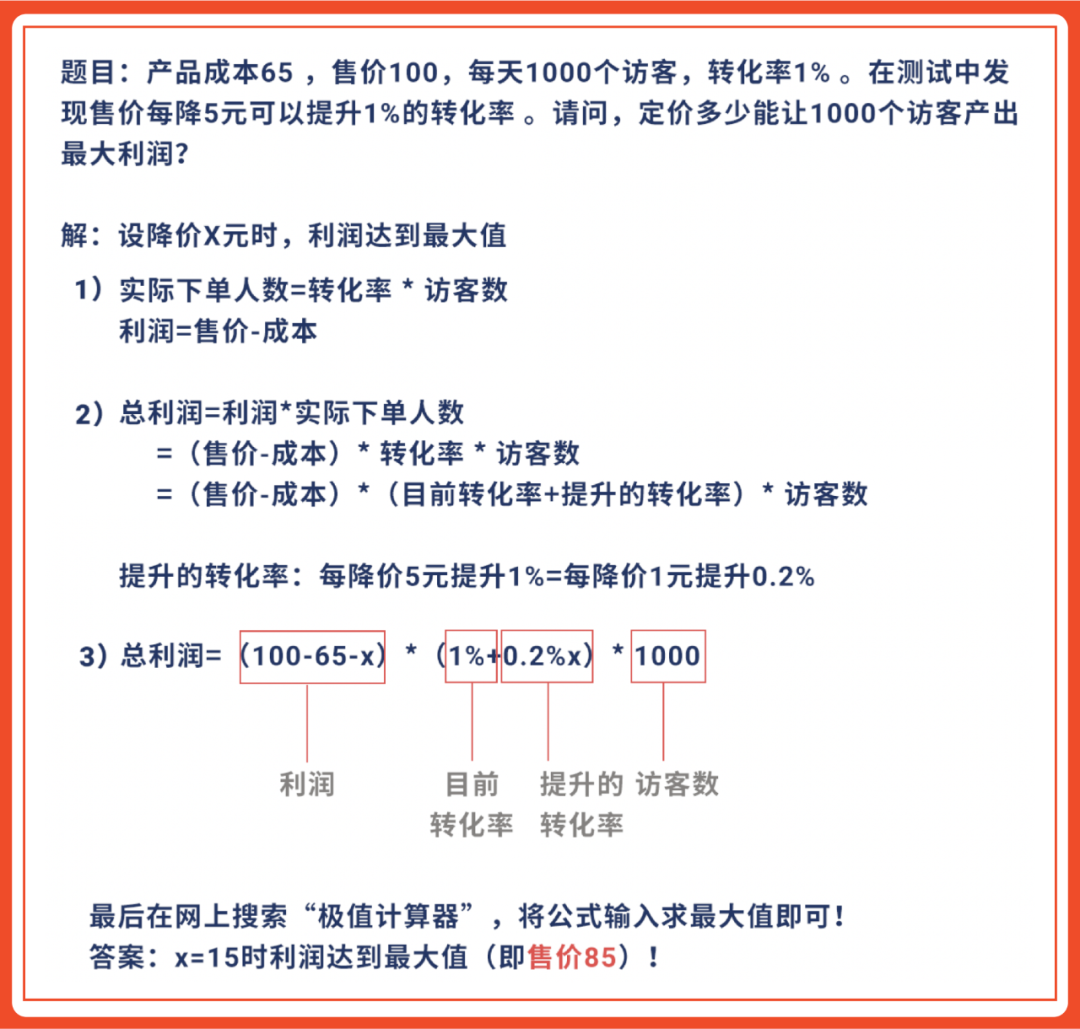 答案是这件产品定价为85元时,达到最大的利润值。具体解题过程,你知道吗?接着看,小编解题过程~也可以作为一到课后作业,听完这堂“转化率提升之课”后,认真思考!