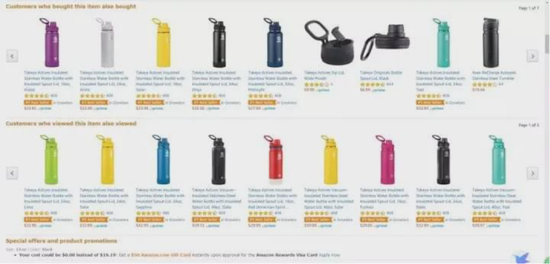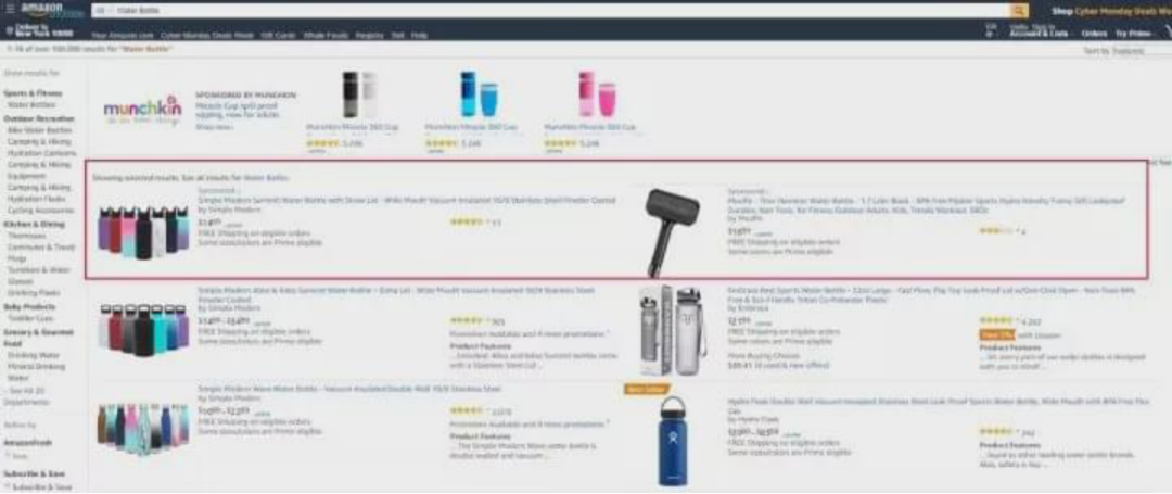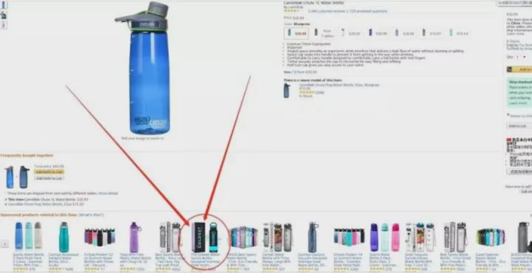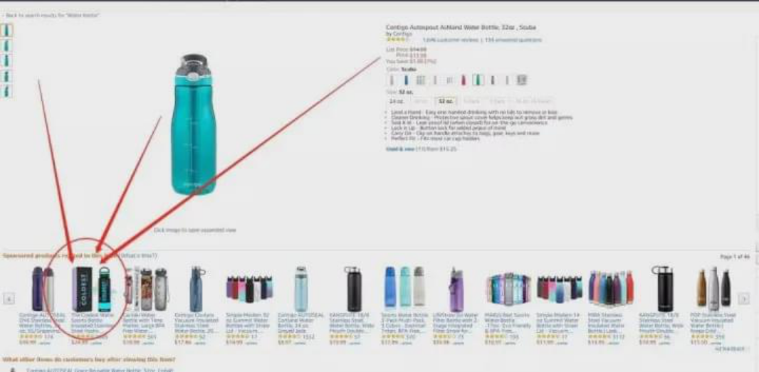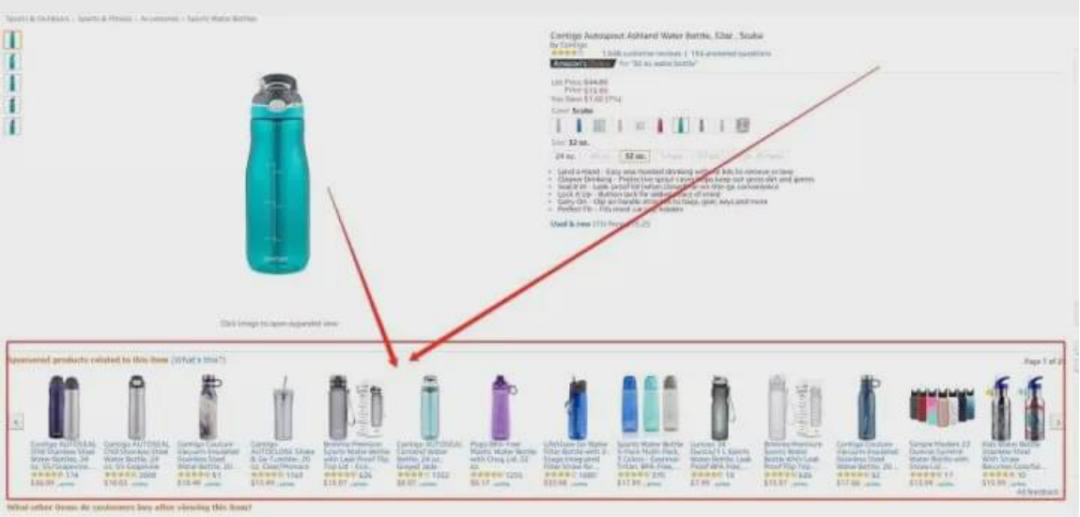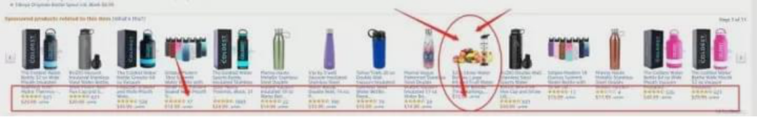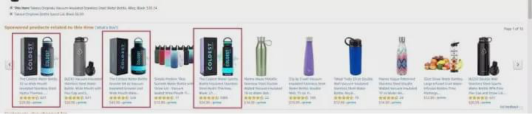 ⑵ 搜索关键词WaterBottle的SERP关键词搜索结果页面中,该页面下所有产品的关联广告Sponsoredproducts related to this item中,如图所示: