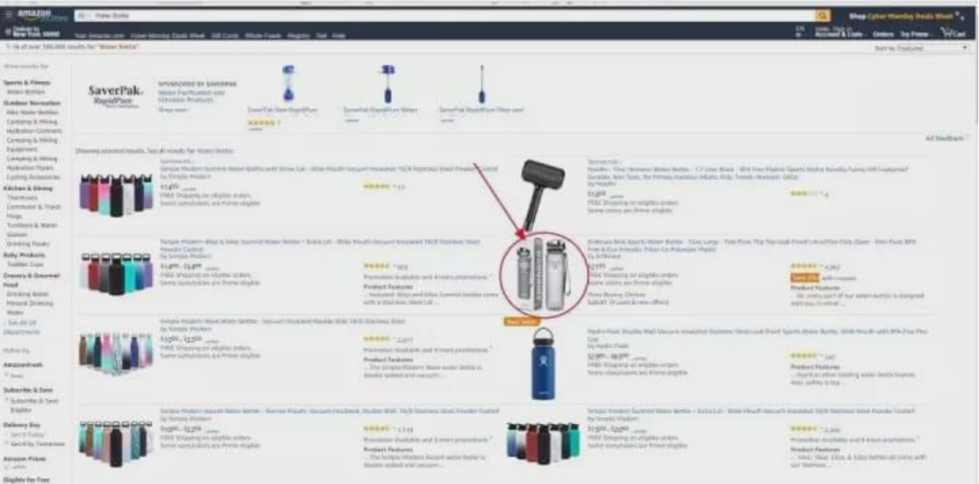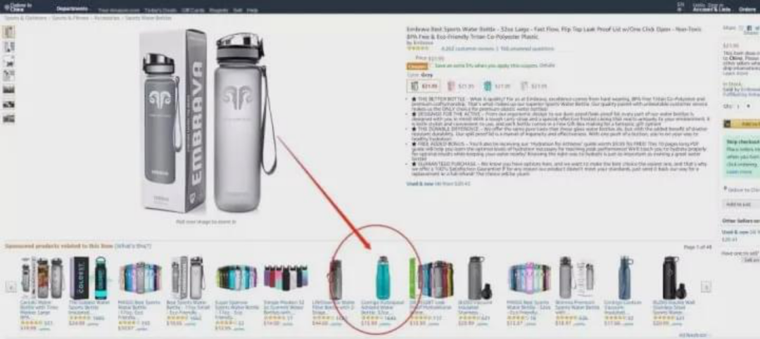 ⑴ 搜索关键词WaterBottle,固定收货地址为美国某州,点击如图产品ASIN1。