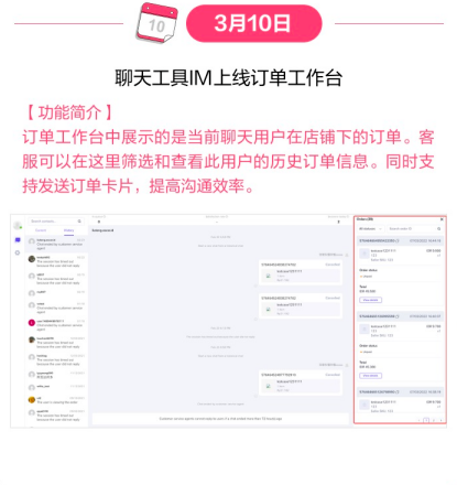 另外和用户私聊的时候可以在工作台直接查看用户下的订单,也可以直接在该界面发送订单卡片,完善了客服售后功能。