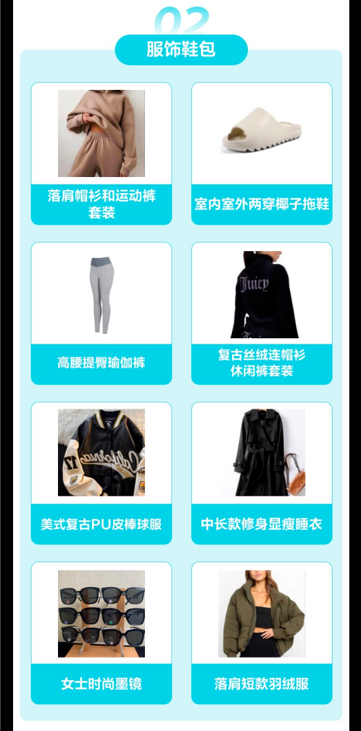 服饰鞋包类目的热销,有相当一部分会随着季节的更替而产生变化,运动套装和椰子拖鞋这两款一直都很受欢迎,另外还有一款上面有emoji笑脸的拖鞋销量也是飞速增长。而秋冬季节下,羽绒服、棒球服和夹克都有可能热销。
