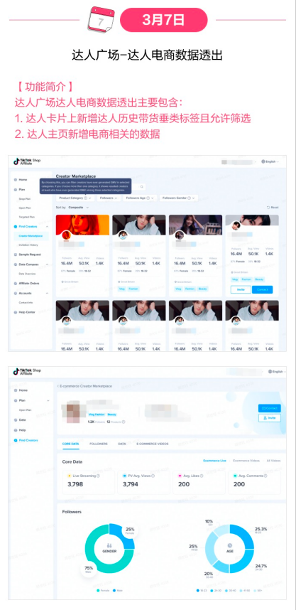注意达人广场的更新,比从前增加了可以筛选的标签,可以查看达人的详细信息、带货数据成绩、带货类目等等,如果有需要寻找达人带货的商家,可以活用这个功能。