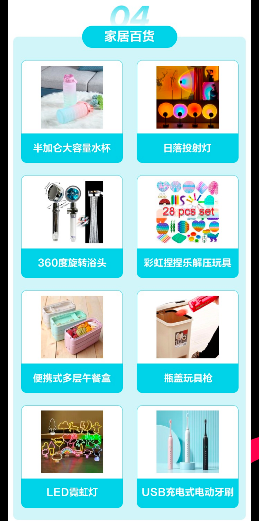 家具玩具比较火爆的类目其实变化不太大,依然是外国人很感兴趣的解压小玩具、各种彩色灯以及日用品。