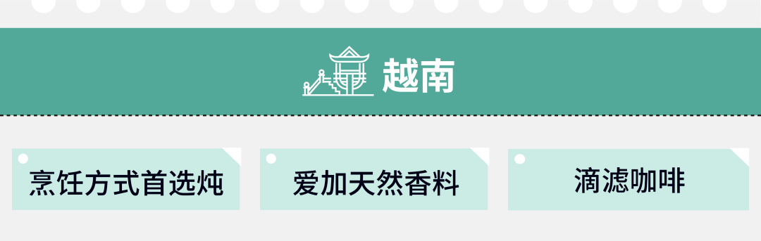 在越南,当地人最爱的烹饪方式是炖,烹调时喜欢加入多种天然香料。越南人的主食是米饭,也爱吃牛肉或鸡肉粉条,日常习惯是喝咖啡。但他们喝咖啡不是用咖啡壶煮,而是用特殊的滴滤咖啡杯来冲泡。深受中国文化影响,越南人也喜欢喝茶。