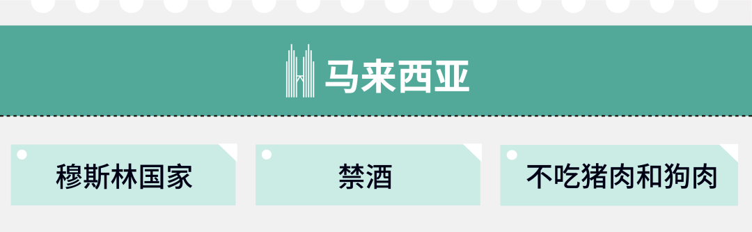 马来西亚是穆斯林国家,不吃猪肉和狗肉,也不使用猪、狗形象制品。马来西亚人平时是用手来抓取食物,只有在宴会、西餐时才会用到刀叉和汤匙。在日常饮食中,马来西亚禁酒,所以用餐时不能喝酒,多以热茶、咖啡或白开水代替。