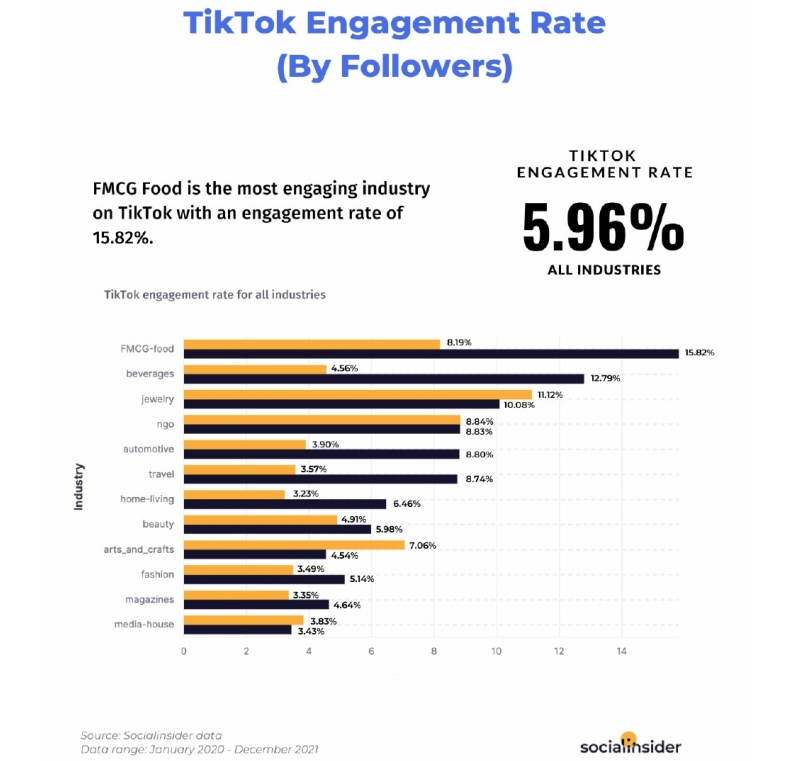 根据Socialinsider的数据,包装食品品牌再次领跑,平均参与度高达15.82%,饮料(12.79%)和珠宝(10.08%)均超过两位数,再就是工艺美术(4.54%)、家居(6.46%)、美妆(5.98%)、时装(5.14%)。