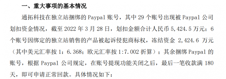 其中,跨境大卖通拓科技发布重大事项公示,表示其收付款账号被Paypal划扣、冻结资金造成的损失,其中 29 个账号出现被 Paypal 公司划扣资金情况,截至 2022 年 3 月 28 日,划扣金额合计人民币 5424.5 万元;6个账号因绑定的独立站销售的产品被起诉侵犯商标权,冻结资金 2424.6 万元,折合人民币共计达到7849.1万元,损失十分惨重。