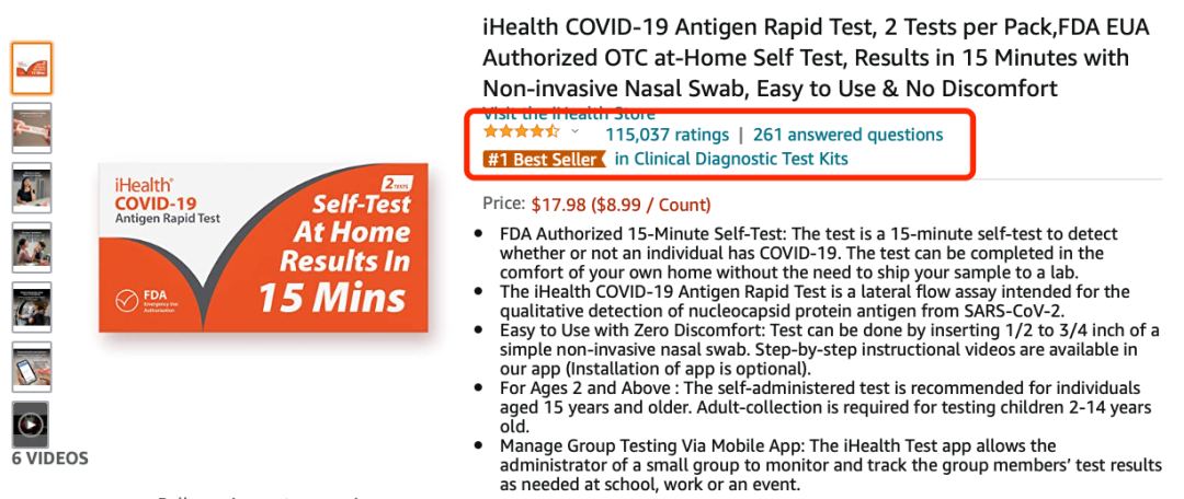 在亚马逊平台,iHealth表现炸裂,新冠试剂盒产品已经拿下亚马逊平台多个类目的Best Sellers第一名,Rating累计已经超过11万个。