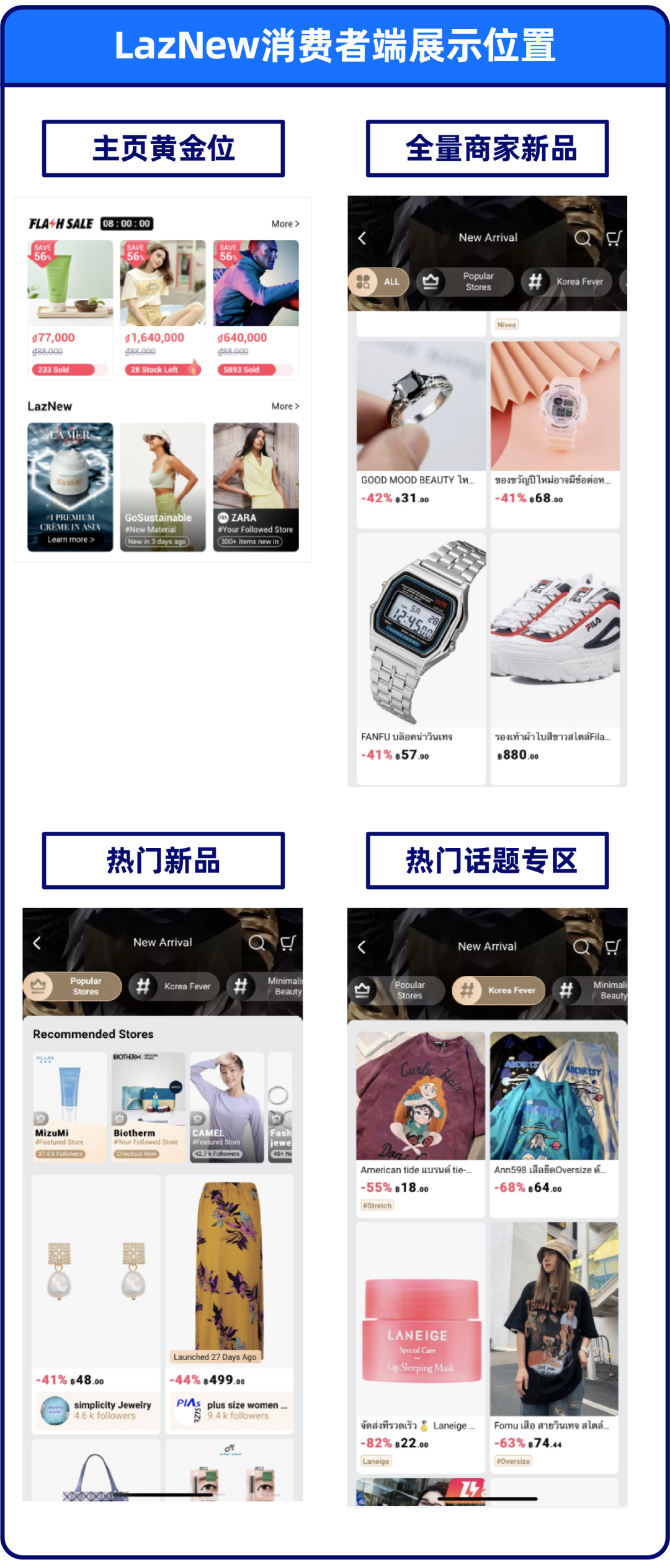 为助力商家孵化新品,Lazada泰国新增新品上新专区——LazNew,位于首页闪购模块的下方。消费者会在此专区挑选新款,商家可以利用上新专区来获取更多曝光和流量!除了新品外,平台还设立了“热门话题专区”,如韩流专区为商家提升热度和引流,聚焦更精准客户和风格爱好者,感兴趣的商家可以前往卖家中心 > Marketing center > Campaign申请加入。