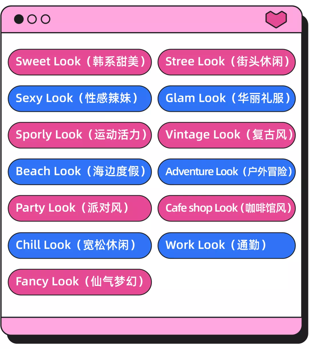 值得一提的是,Lazada泰国站自2022年1月份起,一级入口【LazLOOK】服饰板块将主推以下13种女装风格的产品。聚焦更多的风格化服饰爱好者,收割更多的流量。