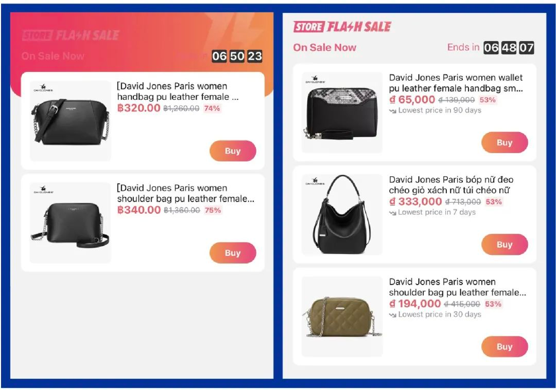 3月27日当天,女士泳装类目的跨境商家家全站点销售额较去年同期翻了4倍,发饰类目达到同期近3倍,越南站女士上衣和女士连衣裙达到去年12.12当天的200%。其中风格化女装品牌VERO MODA大促首日销售额对比12.12同期增长580%+,店铺多款爆款连衣裙上线闪购,10分钟狂销1200+件。