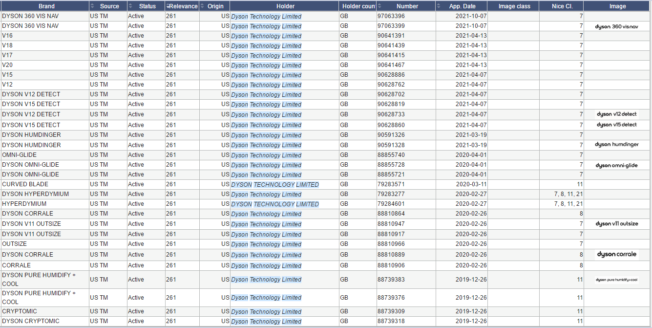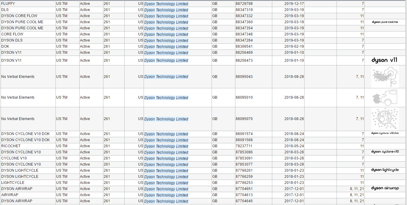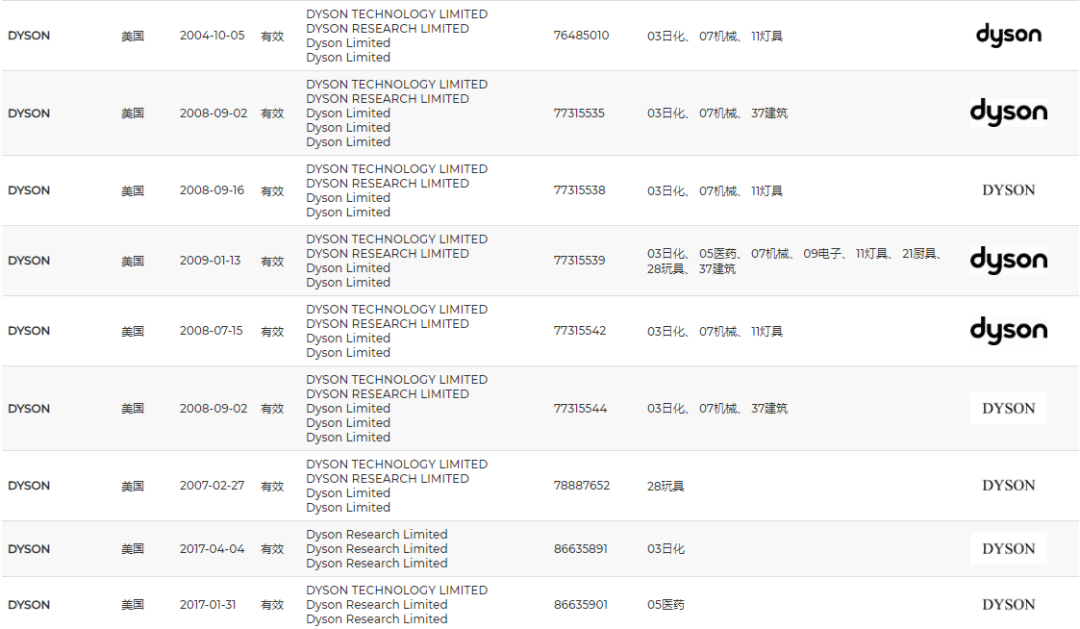 Dyson也是商标大户,坐拥大量注册商标,除品牌名称外,其他商标也要格外留意和规避: