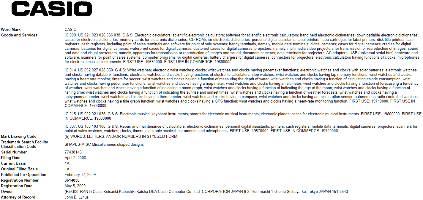 品牌名称CASIO是注册商标,注册在09、14、15等多个类目,不可在listing上使用: