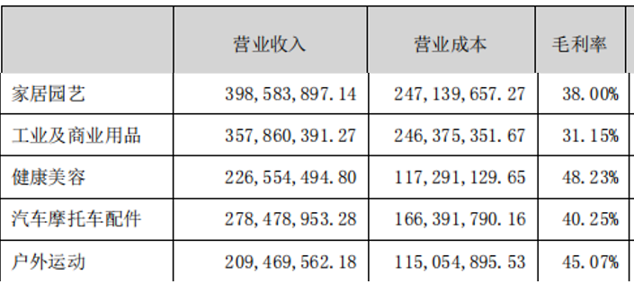 在易佰并表后19.52亿的营业收入里,贡献比超10%的品类分别为家居园艺、工业及商业用品、健康美容、汽摩配件、户外运动。其中,家居园艺营收贡献占比最大,为19.21%;其次是工业及商业用品,占比达17.25%。
