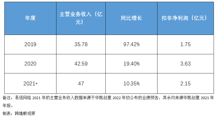 合并报表后,易佰网络的全年营收数据不再单独列表公示。但根据华凯创意2022年初公布的业绩预告,易佰网络全年营业收入约为47亿,同比2020年增长10.35%。
