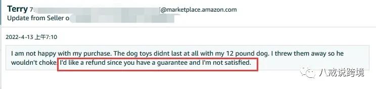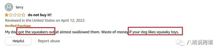 但是我们dog toys产品却属于不会发声的那个dog toys类目,所以根据这一点,能100%确定该名顾客肯定是先前购买了大量的dog toys玩具,最后某款squeaky toys出现了问题,就把责任错误的记在了我们的头上。