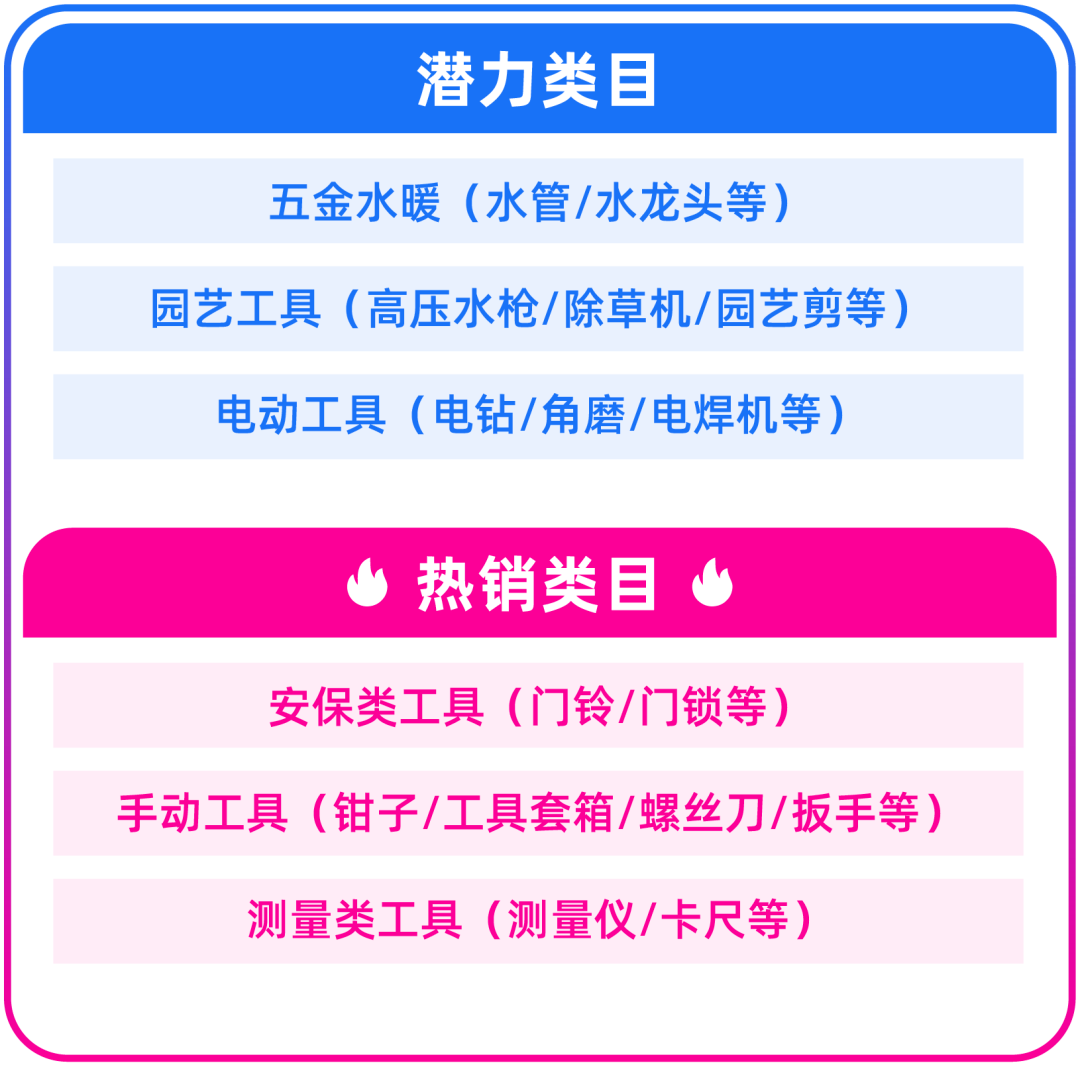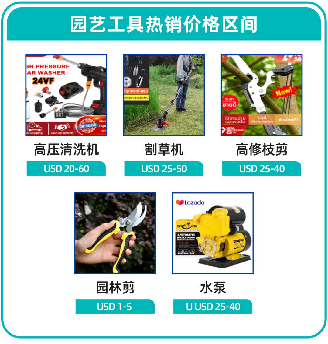 东南亚多数国家的居民在家装维修上还是以自己动手为主,小至家中的桌椅箱柜组装、家电维修,大至木屋修缮都由自己解决,因此无线手持电钻和电扳手成为刚需。面对不同工作需要,便携式配件套装和工具套装该类目的热销商品。消费者在购买套装商品时,会注重不同配件搭配和便携性。因此除了国内常见的家用工具外,部分诸如电锯、角磨机等工用的工具也有稳定销量。
