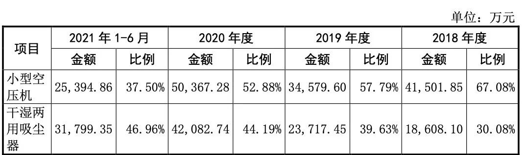 在2018-2020年三年里,小型空压机收入占大头,2020年达到5亿元左右。到了2021年上半年,干湿两用吸尘器收入占比首次超过小型空压机。