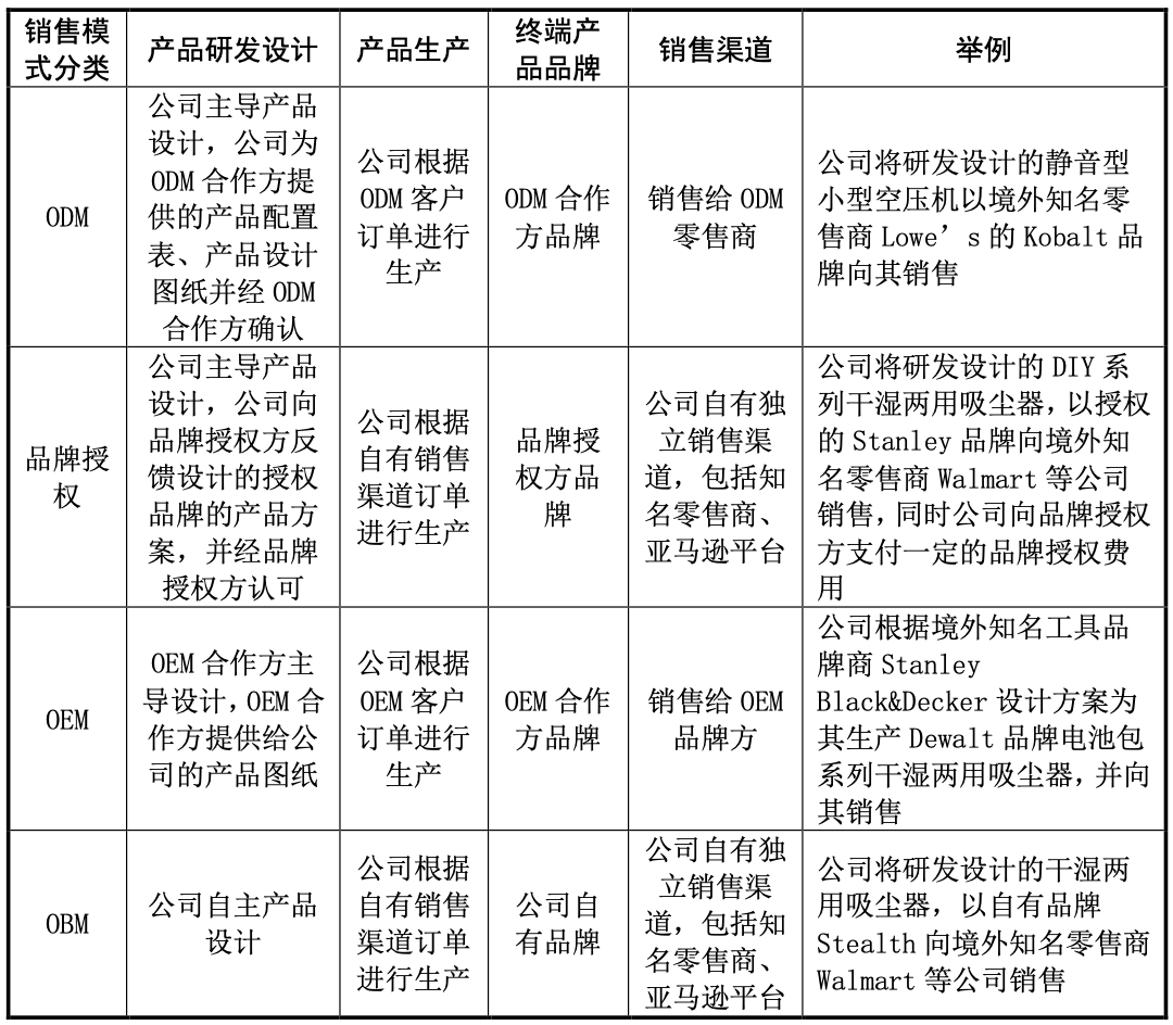 欧圣电气以ODM模式、品牌授权模式为主,自有品牌(OBM)和OEM为辅。在亚马逊、沃尔玛上,欧圣电气既销售自有品牌Stealth,也销售Stanley等品牌授权的贴牌产品。